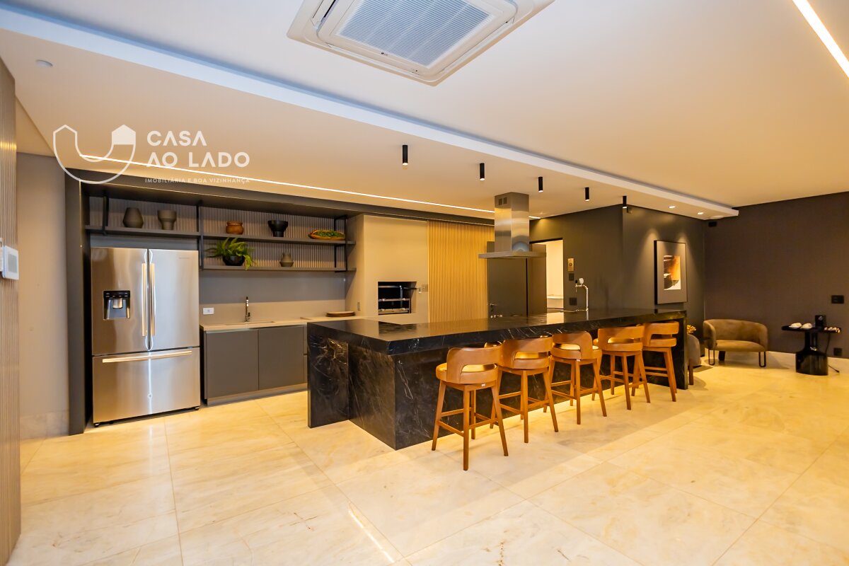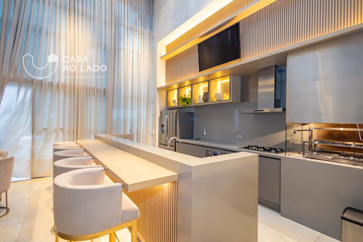 A cozinha é ampla e muito iluminada, equipada com ilha central e eletrodomésticos das marcas Coifatec, Crissair e Tecno. Há ainda despensa e lavanderia espaçosas. O imóvel possui armários planejados Gava, aquecedor e circulador de água quente, preparação para aspiração central e fechadura eletrônica.