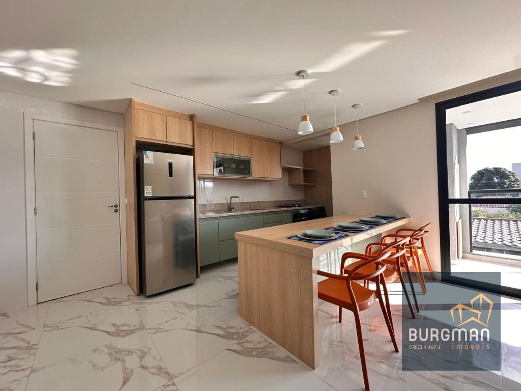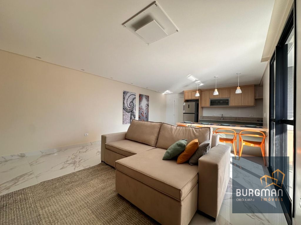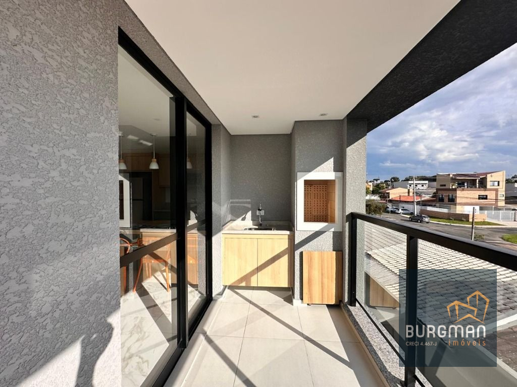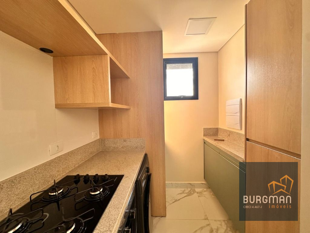 * Sala de dois ambientes e cozinha integrada, com sacada dispondo de churrasqueira e piso em porcelanato;