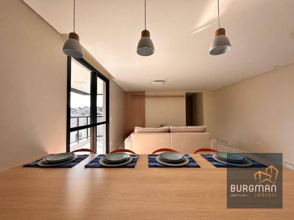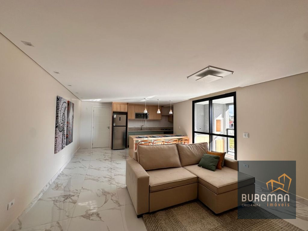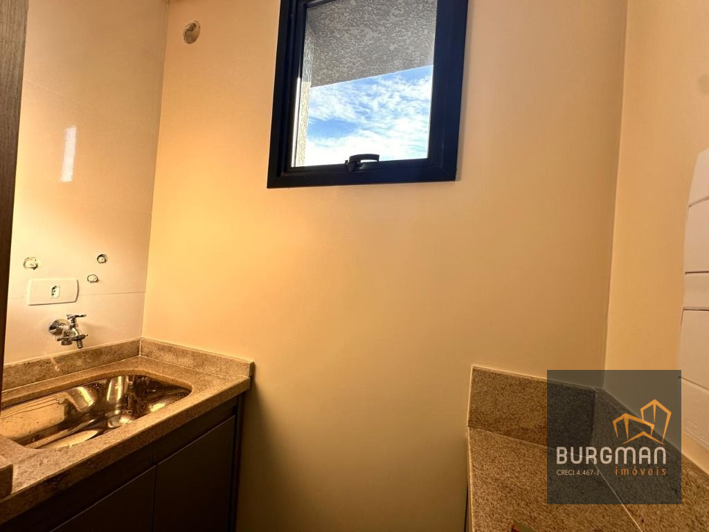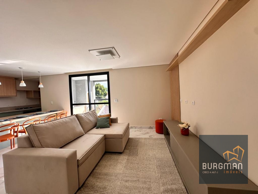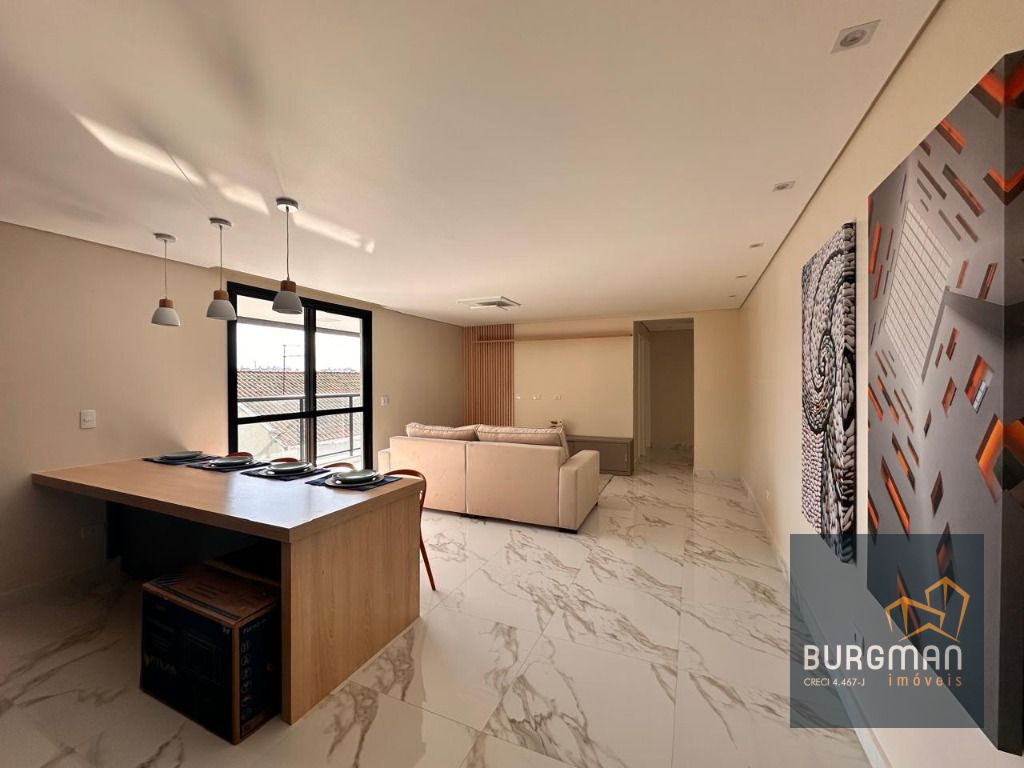 * Sala de dois ambientes e cozinha integrada, com sacada dispondo de churrasqueira e piso em porcelanato;