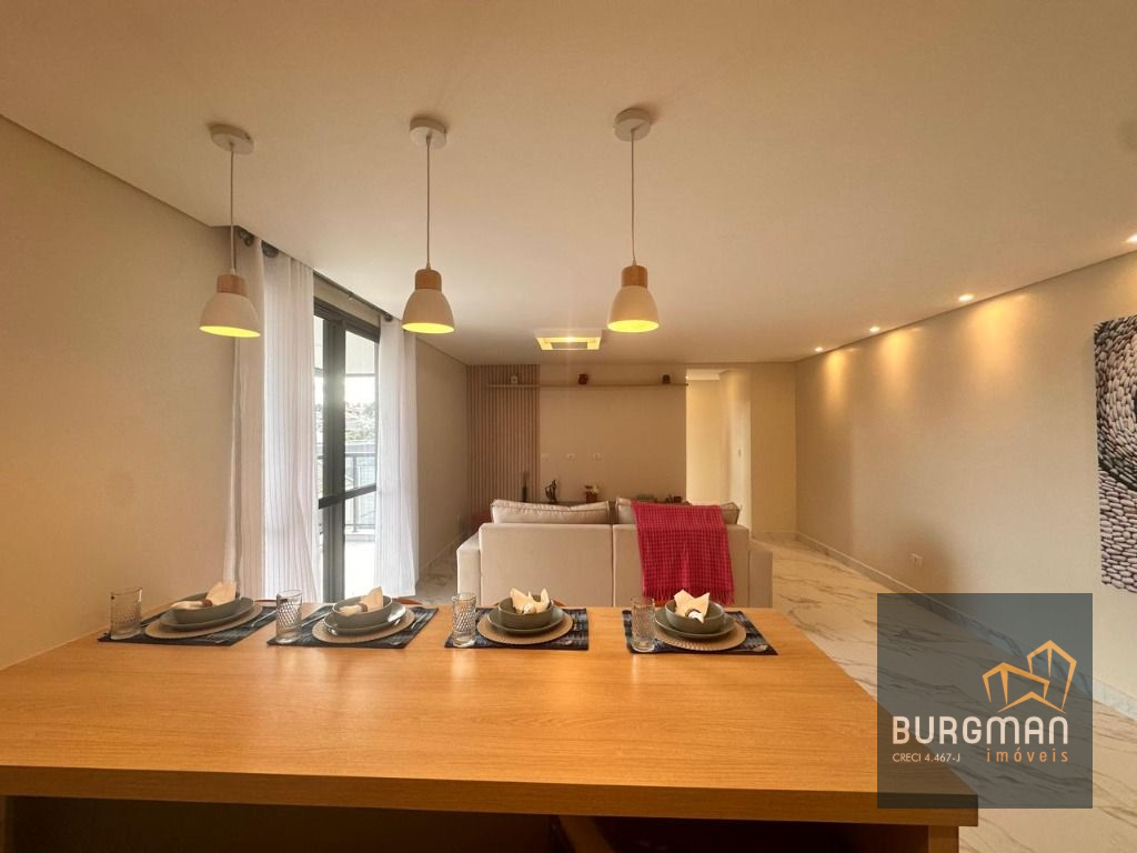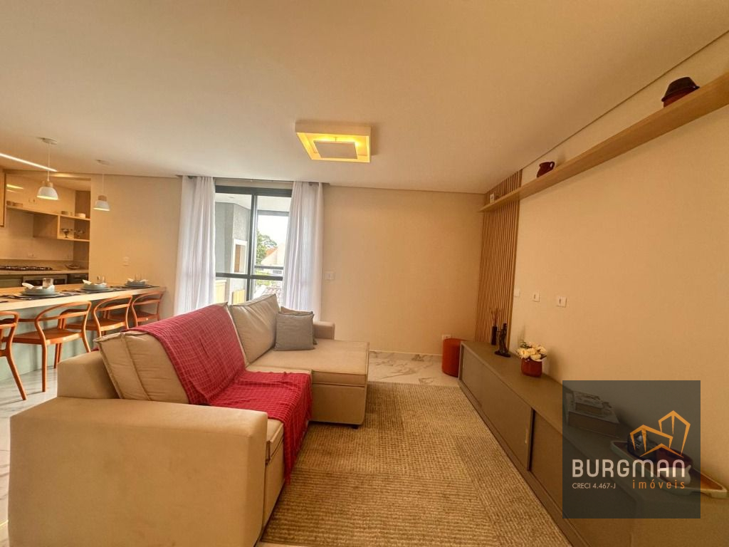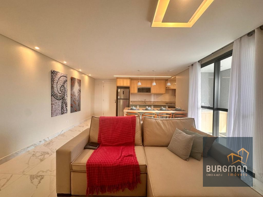 * Sala de dois ambientes e cozinha integrada, com sacada dispondo de churrasqueira e piso em porcelanato;