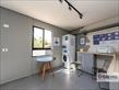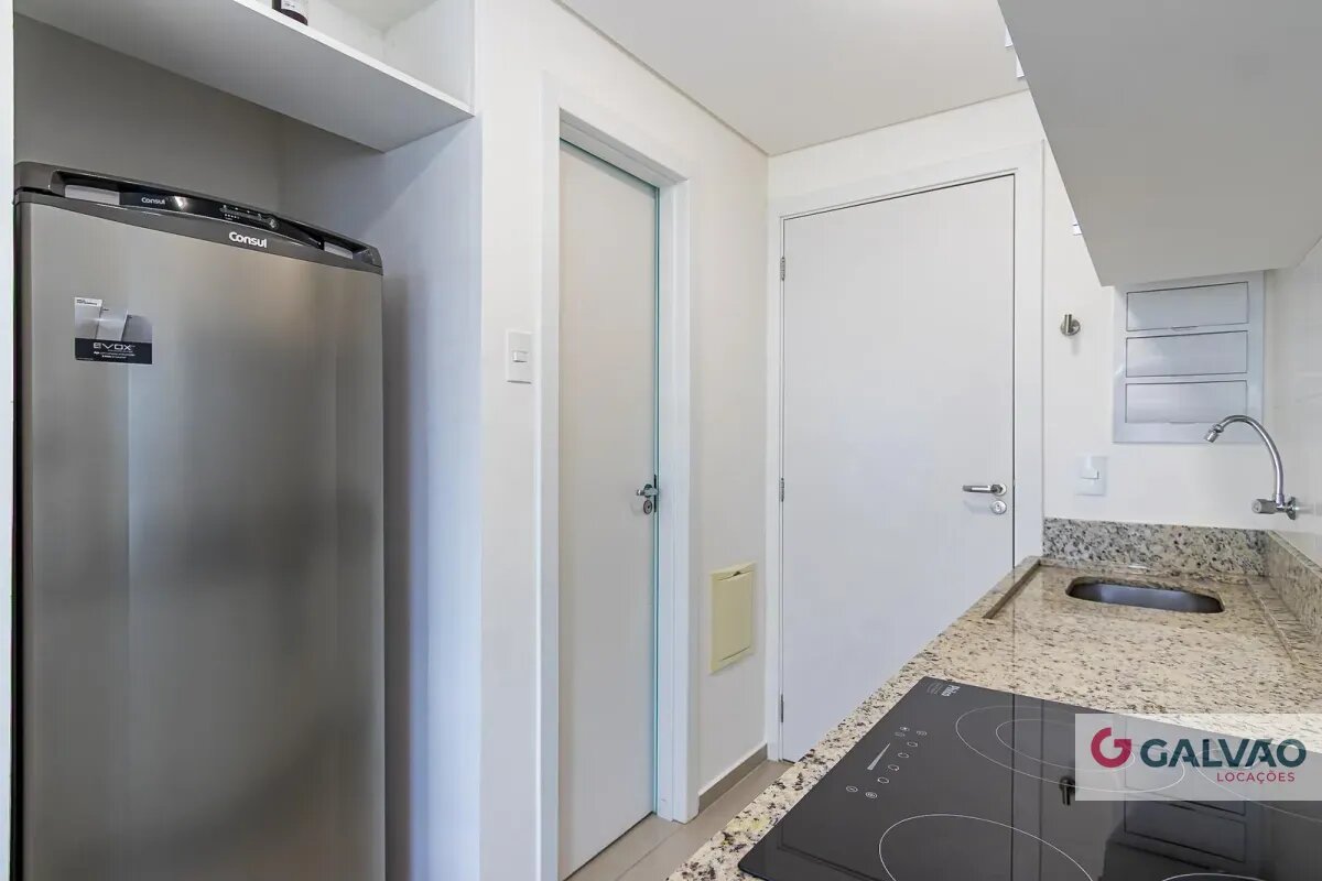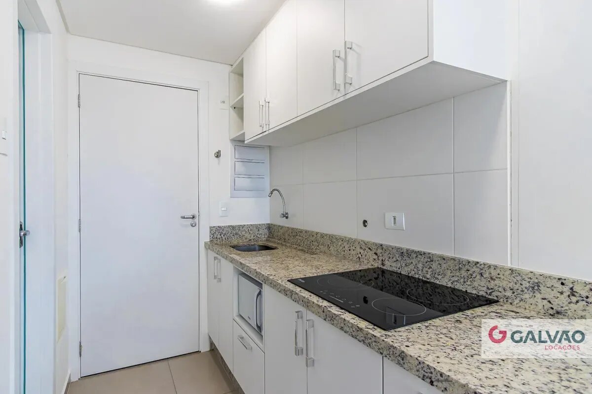 Cozinha completa com armários planejados, fogão, geladeira e micro-ondas