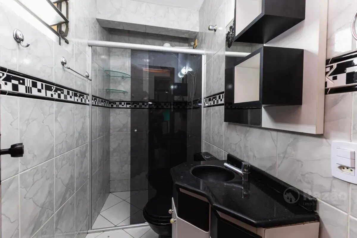 Banheiro social completo apresentando box de vidro para maior conforto e higiene