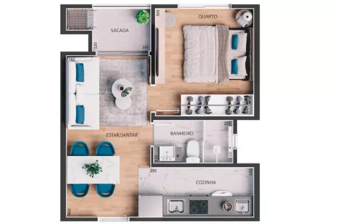 Piso porcelanato (exceto no quarto/área íntima).