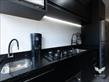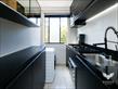Cozinha com armários, fogão cooktop e forno elétrico embutido.