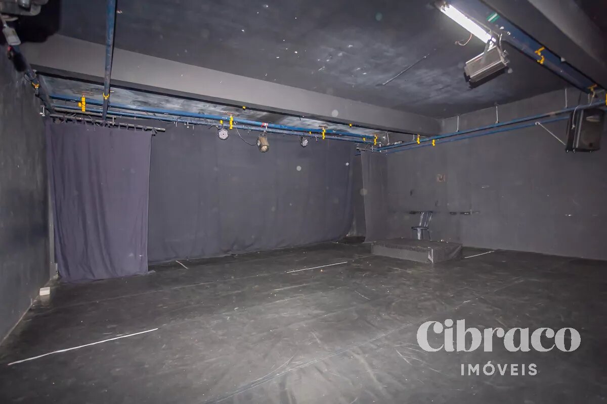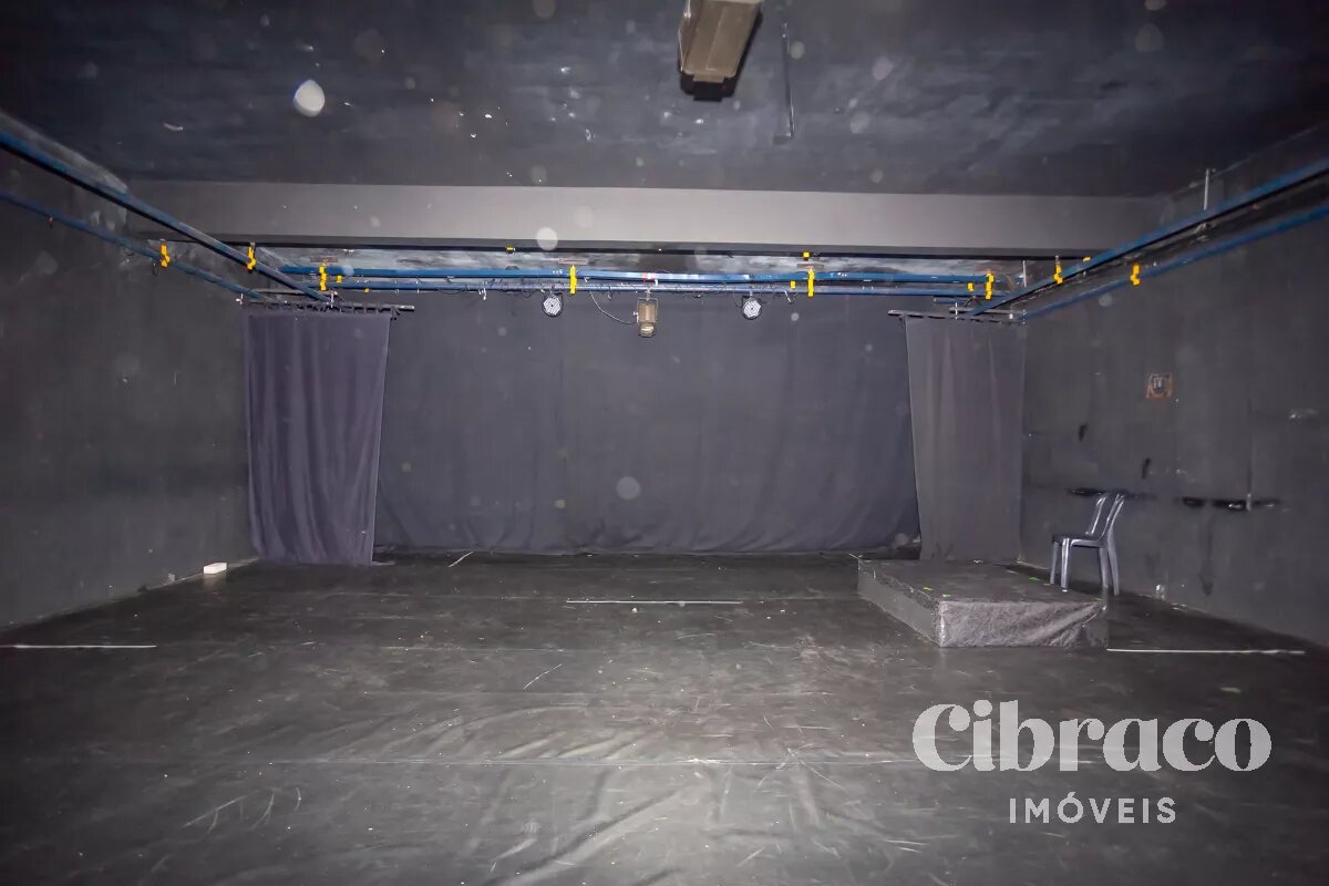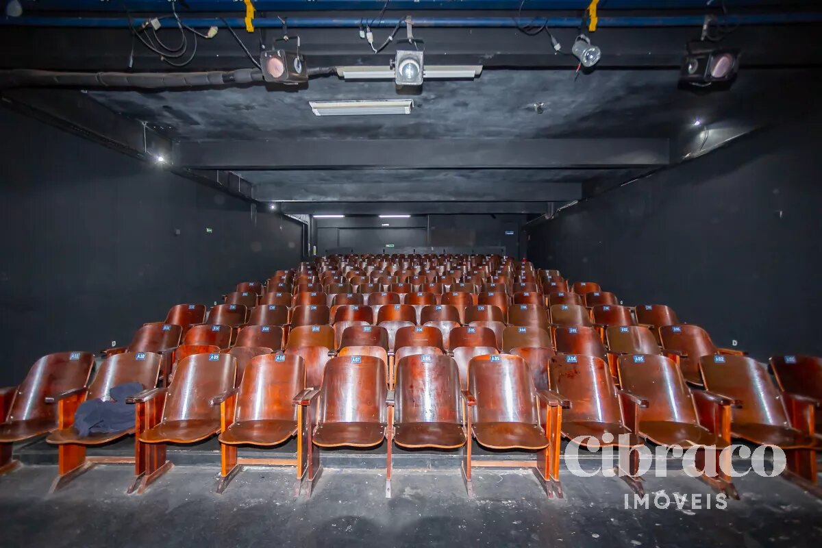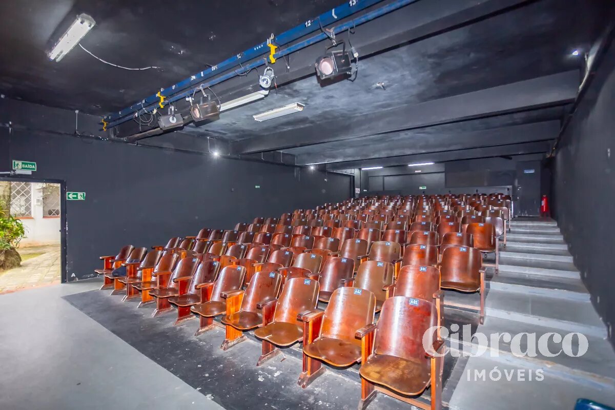 Teatro com 150 lugares, camarim e 2 banheiros e mais 2 banheiros de apoio.