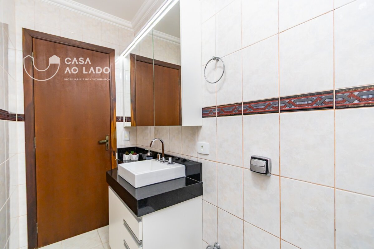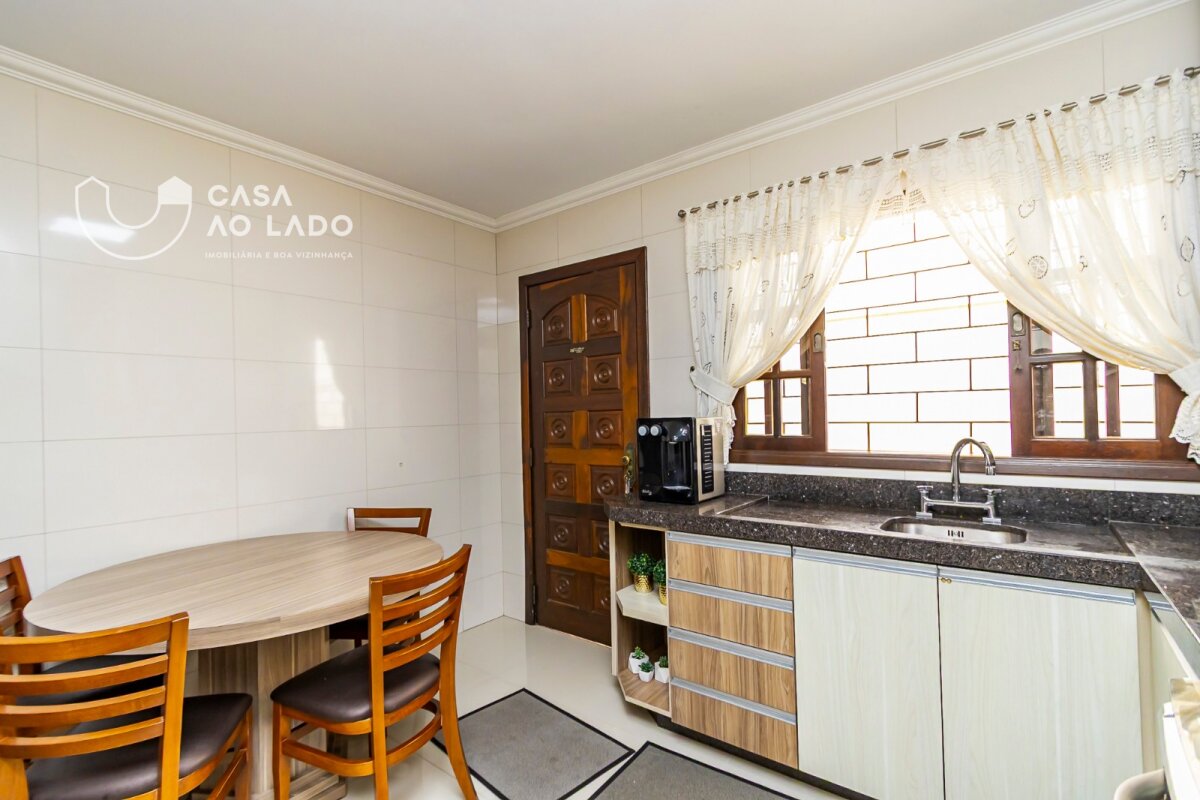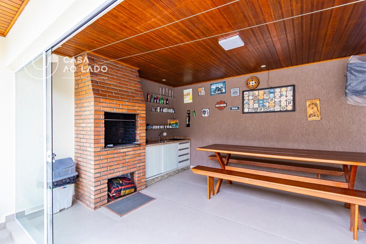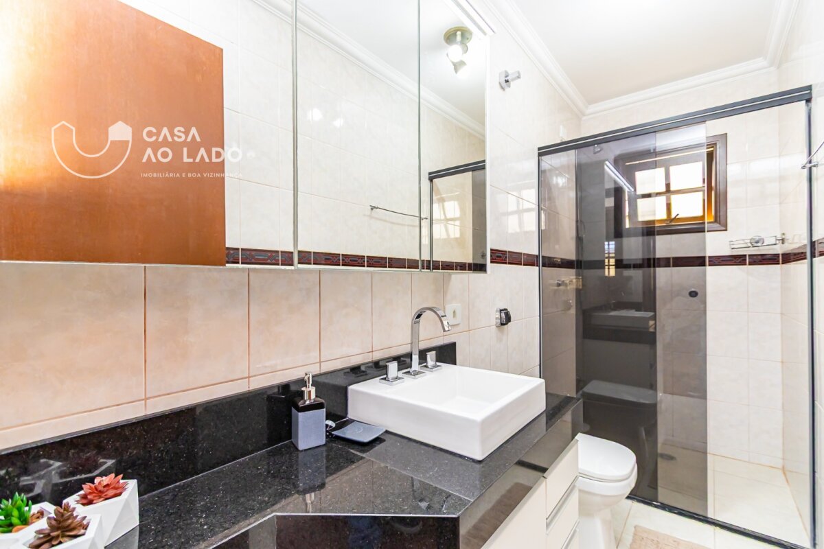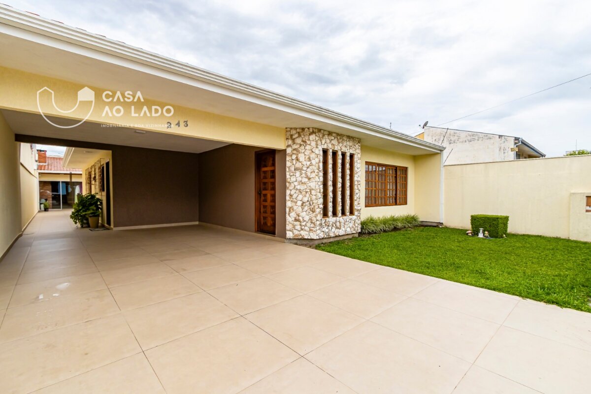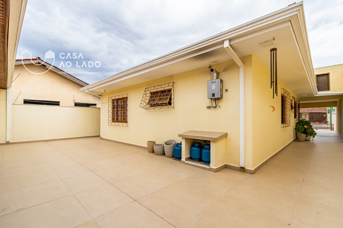 Pensando em conforto térmico, a casa possui aquecedor de água de passagem que atende os banheiros e a cozinha. A área externa é um diferencial, com garagem coberta para dois carros e mais três vagas descobertas, garantindo praticidade e segurança.