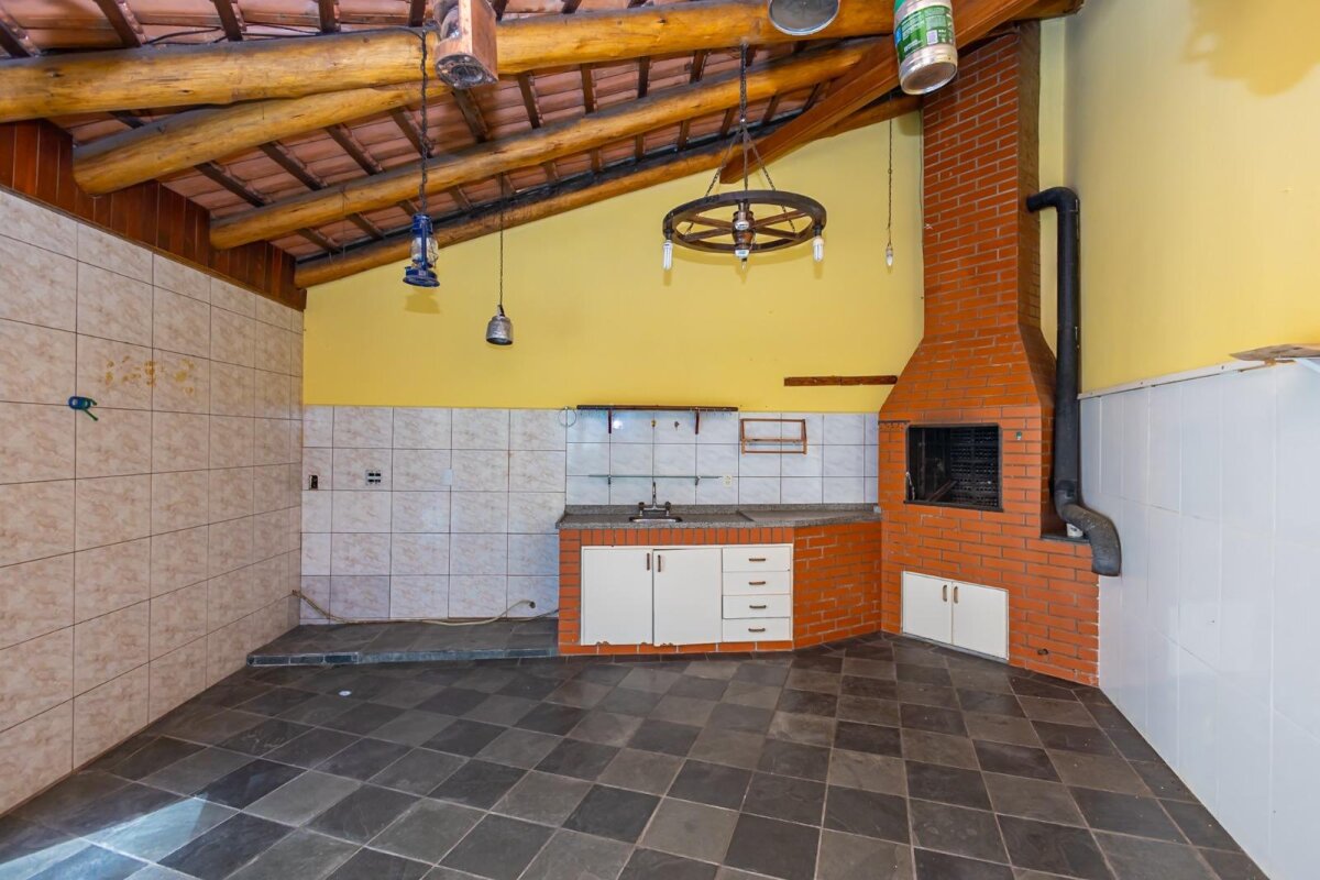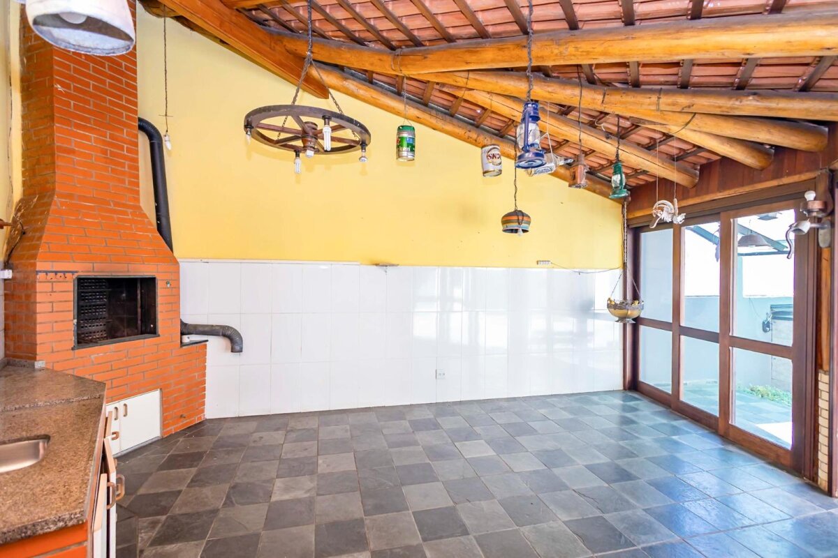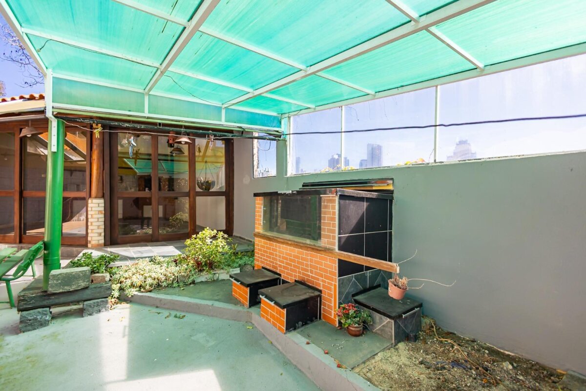 São 3 dormitórios (1 suíte), 3 salas amplas, espaço gourmet com churrasqueira e lareira junto ao quintal, area intima com acabamentos em madeira.