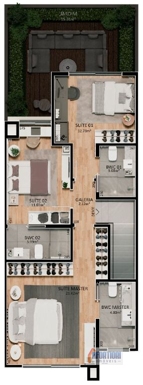 Com 227 m² de área privativa, esta unidade oferece três suítes espaçosas, projetadas para otimizar o conforto e a integração dos ambientes.