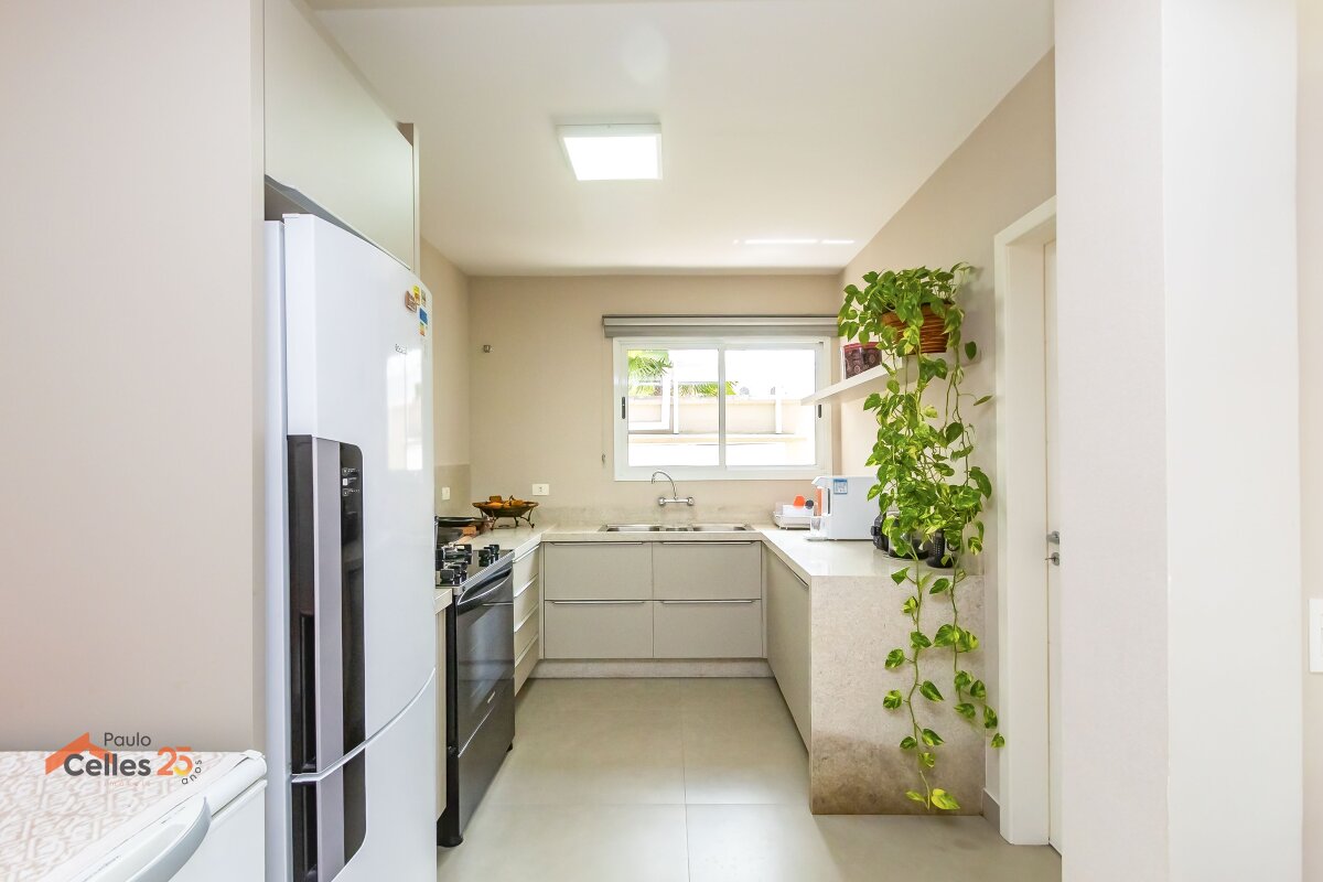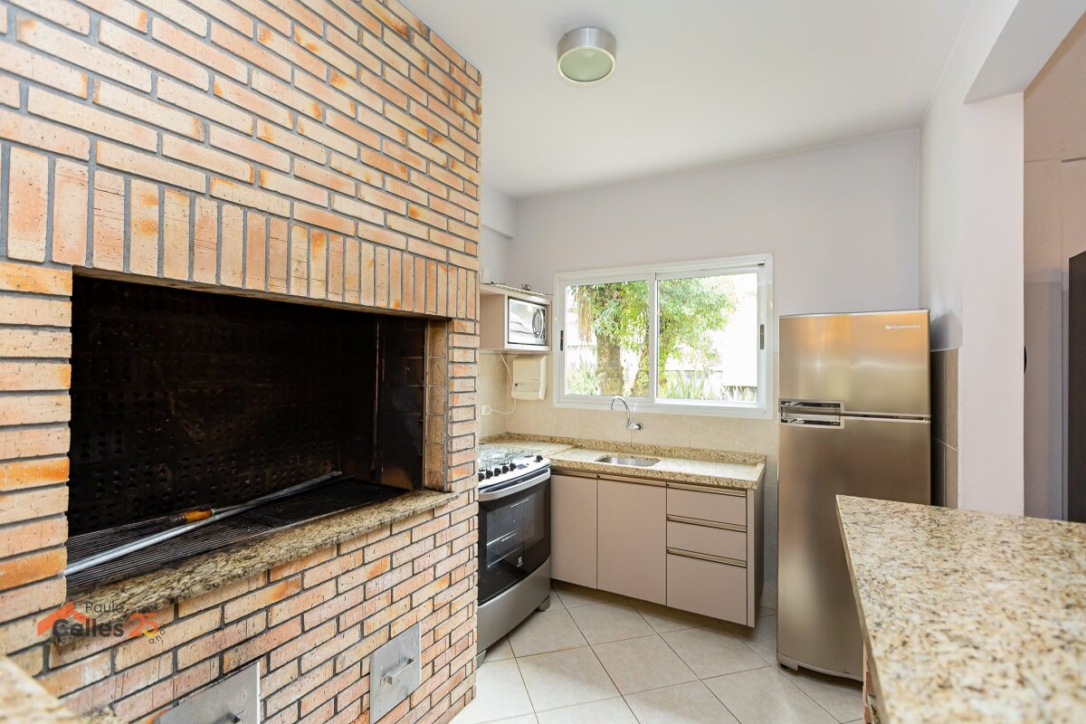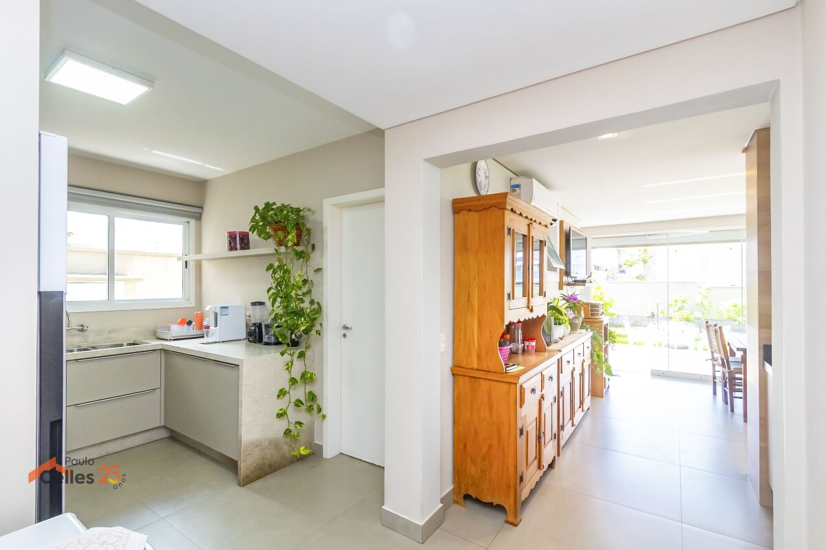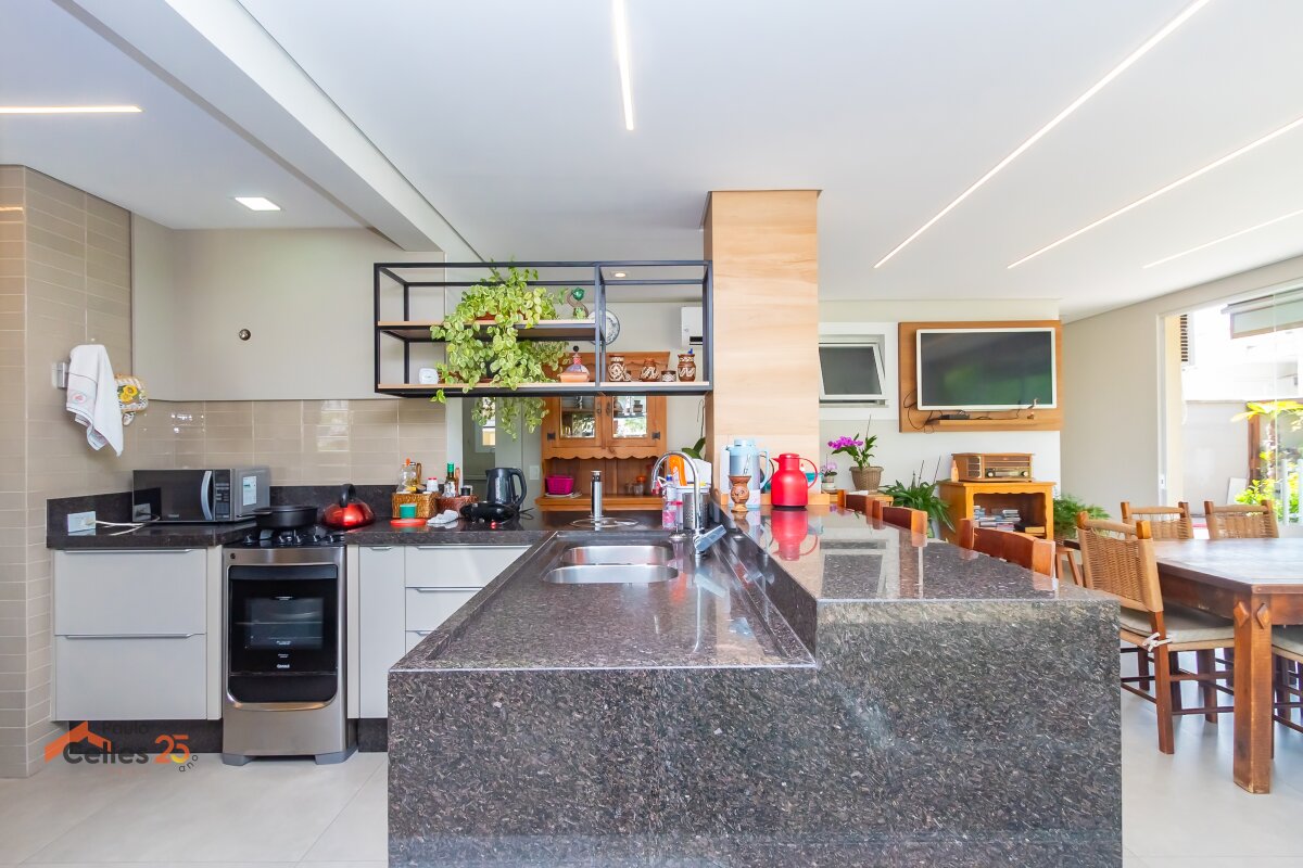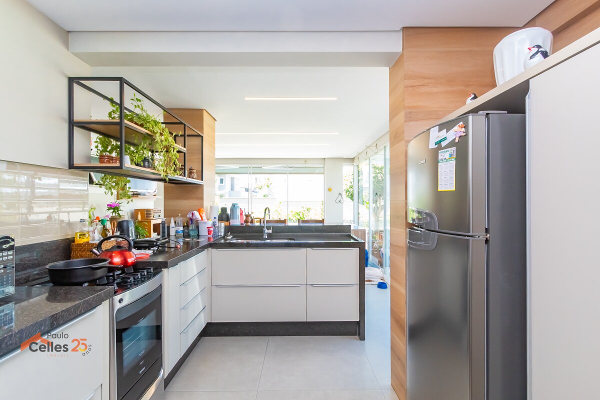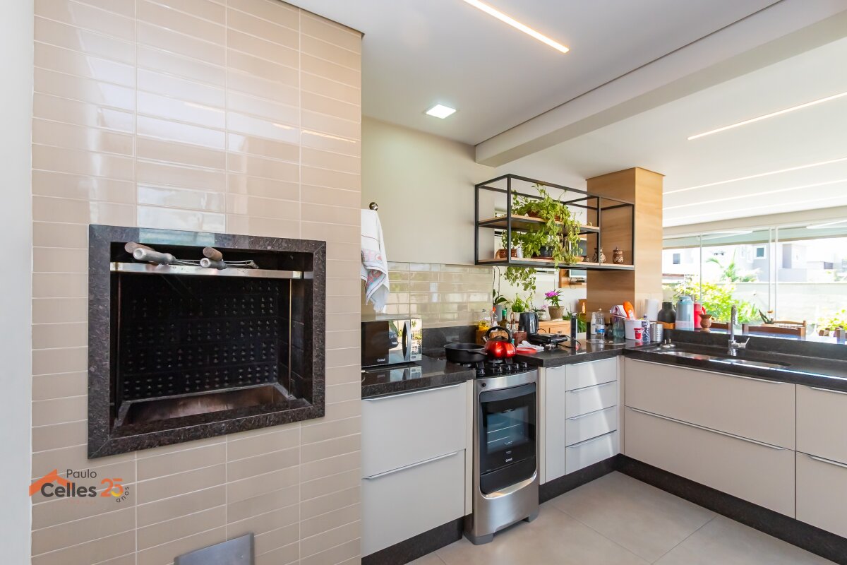 Cozinha integrada ao espaço gourmet com churrasqueira e vista para o jardim;