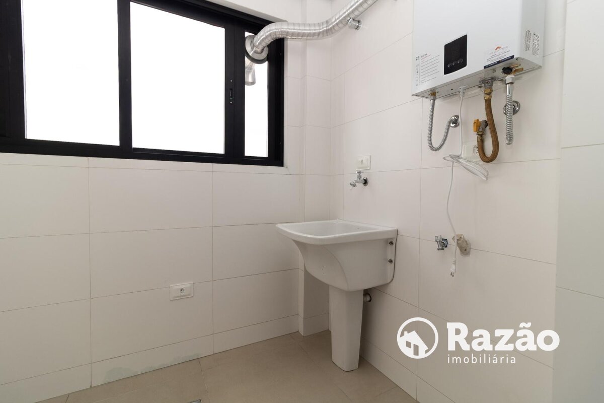 Área de serviço com armário, tanque e espaço para máquina de lavar.