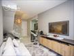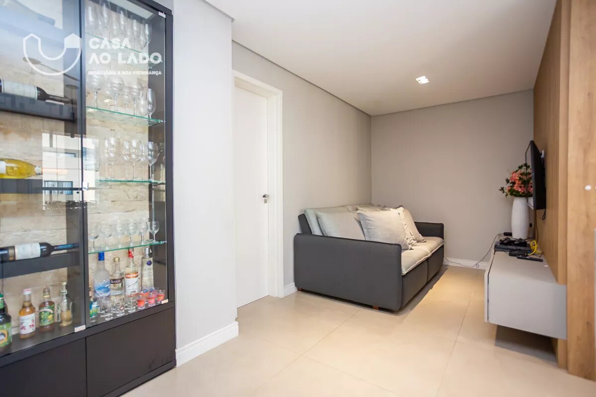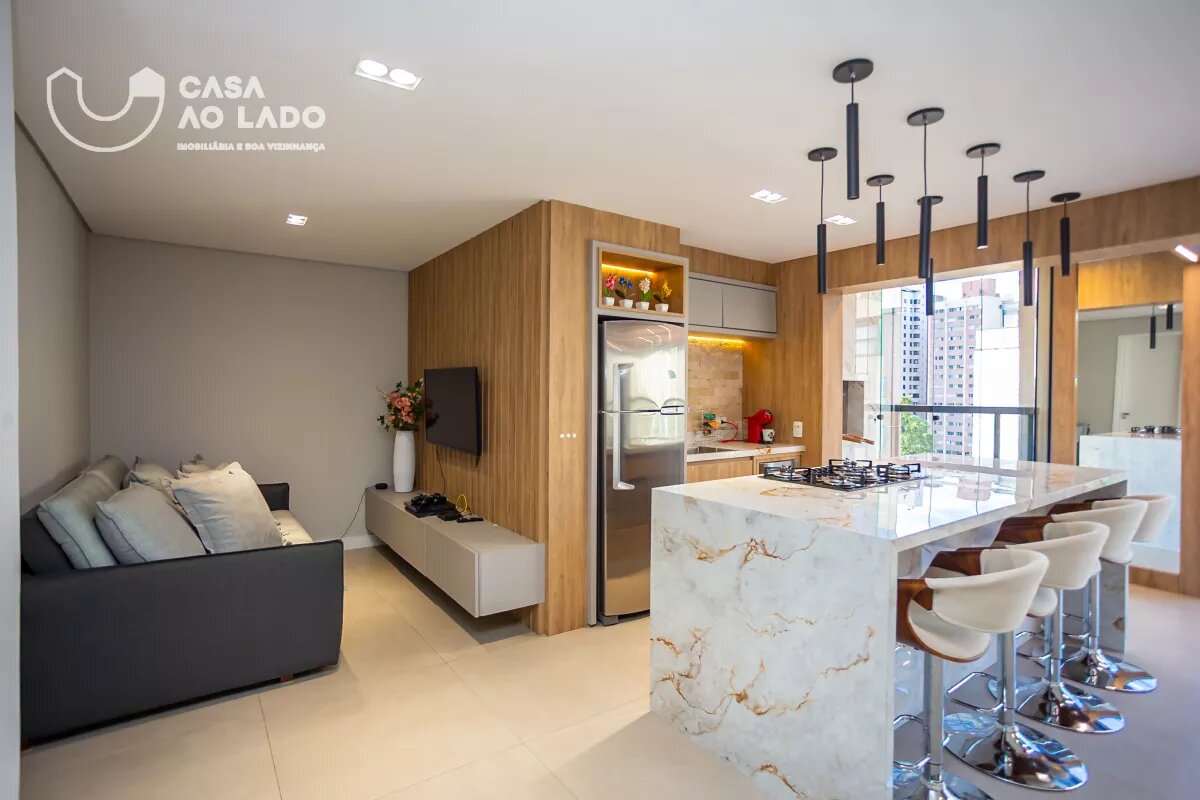 A sala de estar é ampla e elegante, com marcenaria planejada, piso em porcelanato e iluminação embutida em LED.