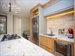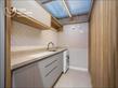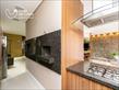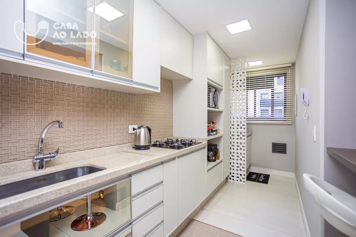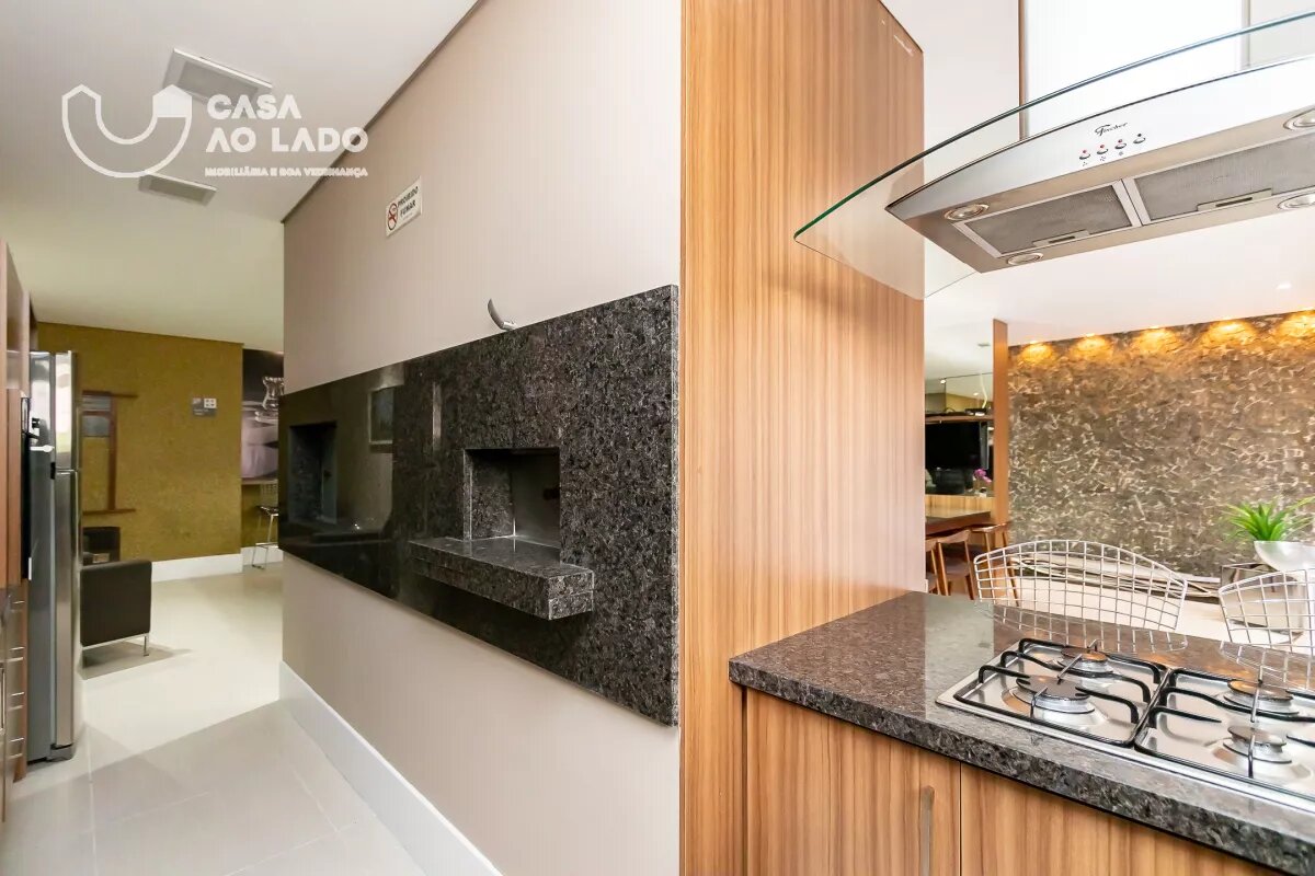 A cozinha principal é planejada, com pia em granito, cooktop e armários sob medida, além de uma lavanderia de apoio.