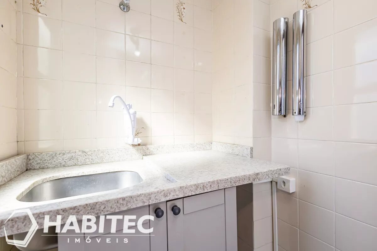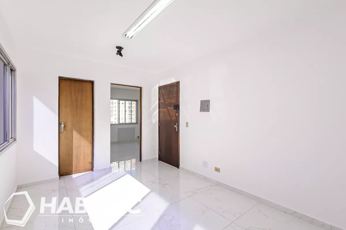 03 Salas claras e arejadas, copa com pia e banheiro, luminárias.