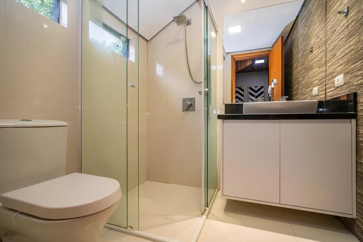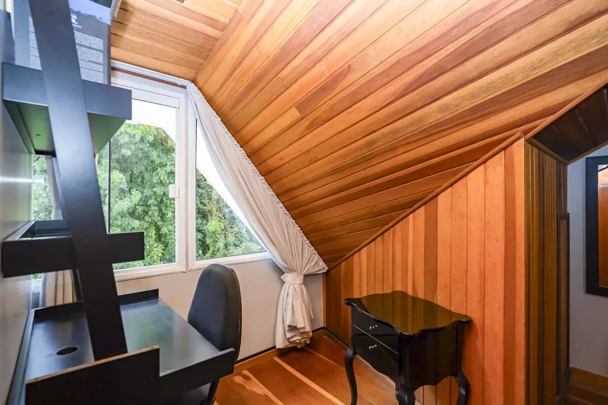 No terceiro piso (ático), 1 ampla suíte. Além de ambiente para uma sala íntima / espaço para jogos, lavabo e escritório.