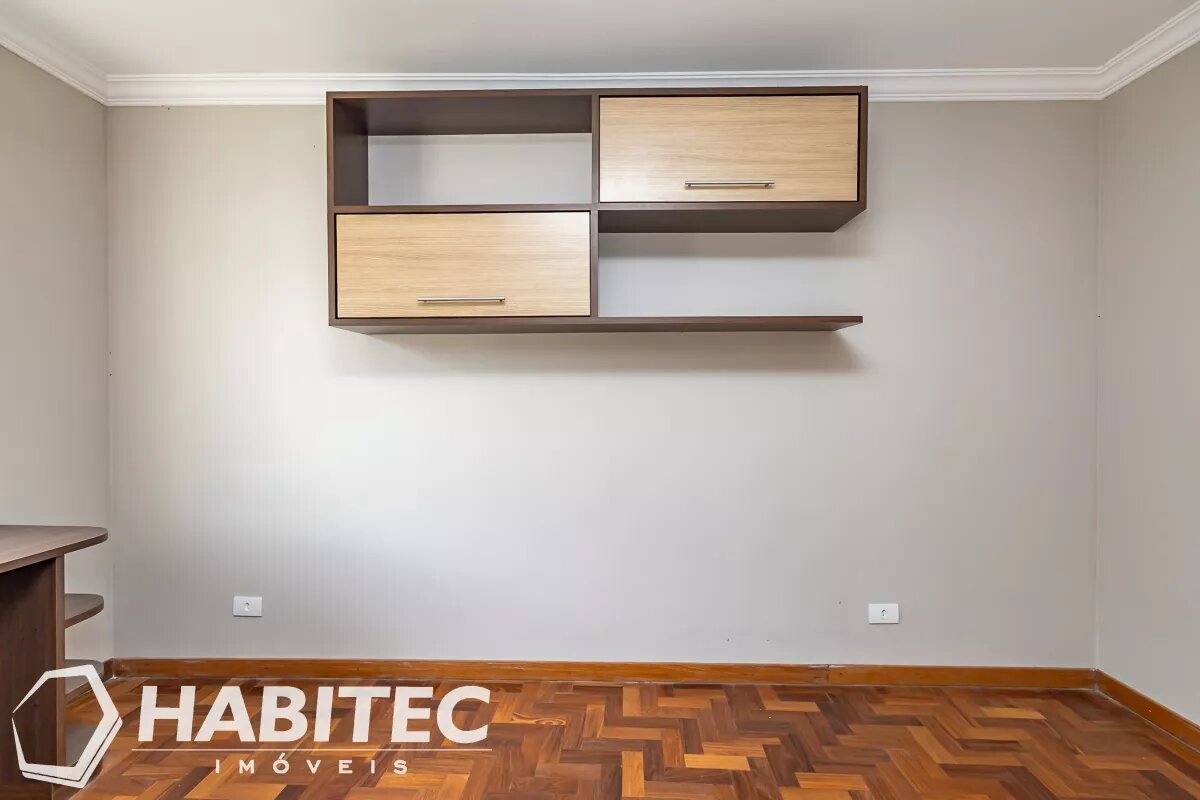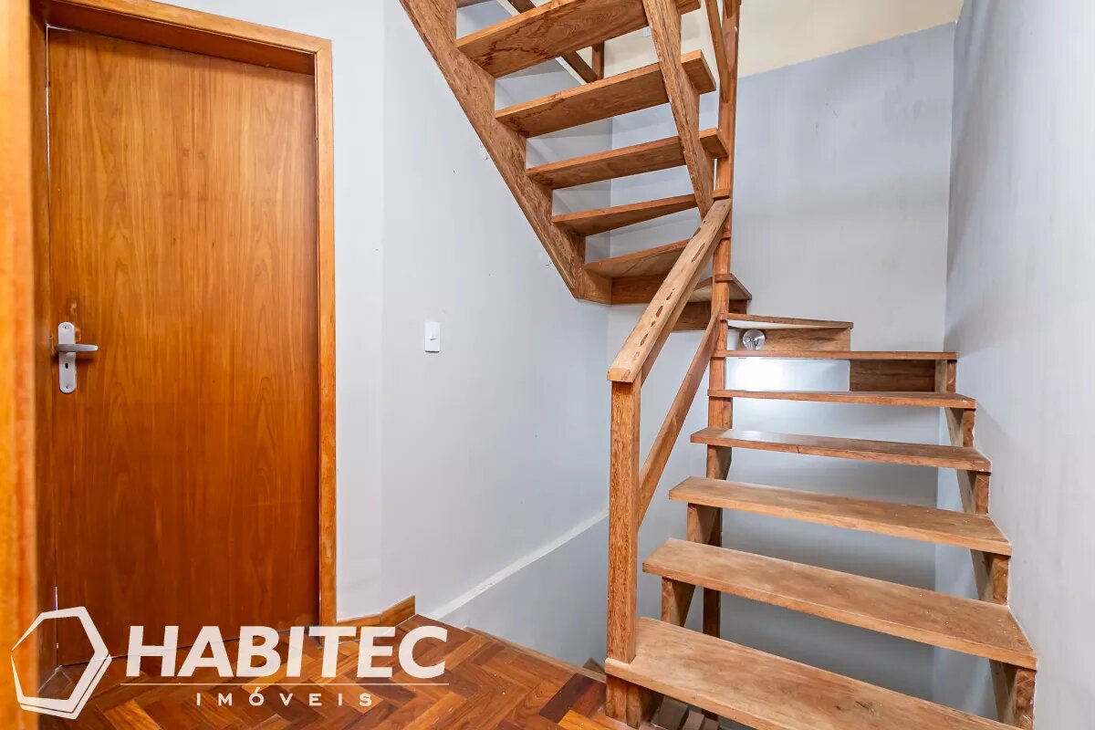 No piso superior, dispõe de três dormitórios, sendo uma suíte, além de banheiro social. Os dormitórios possuem piso em madeira maciça e os banheiros contam com armários planejados.