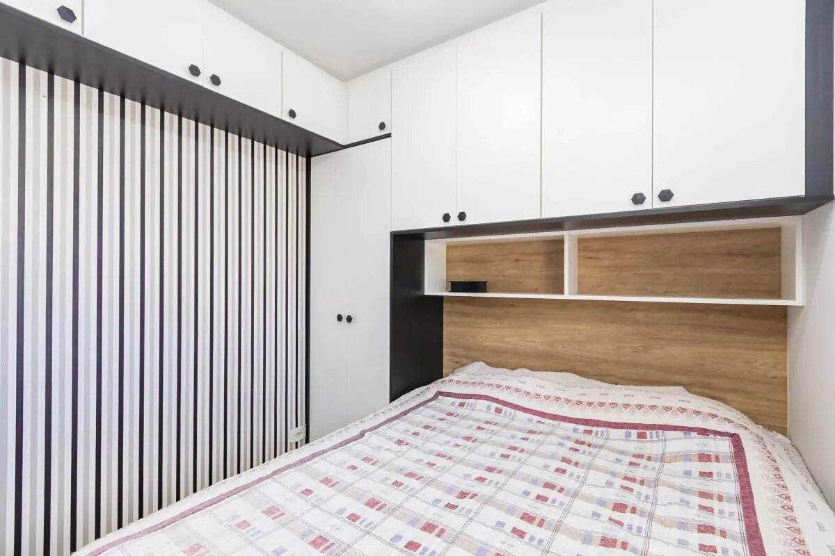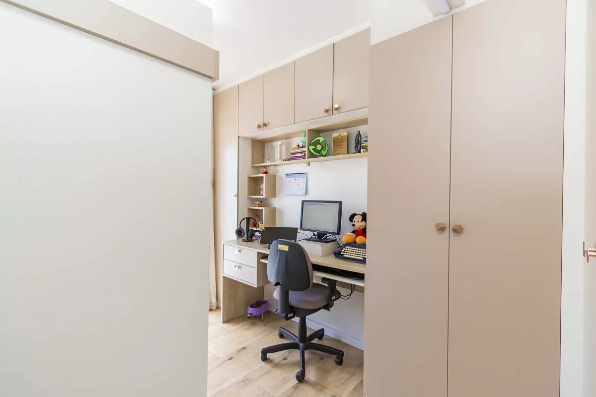 Pavimento superior: três quartos, dois com sacada, Banheiro, todos os quartos com armários embutidos de excelente qualidade.