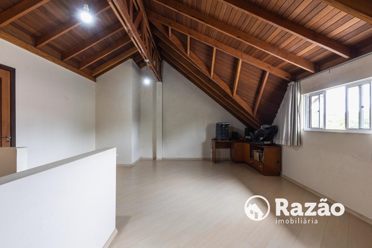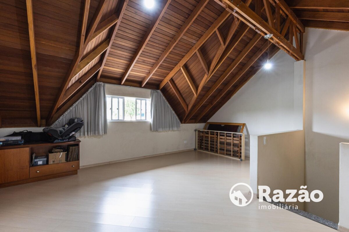 Sótão com amplo espaço sendo utilizado como quarto e sala e ainda possui um depósito.