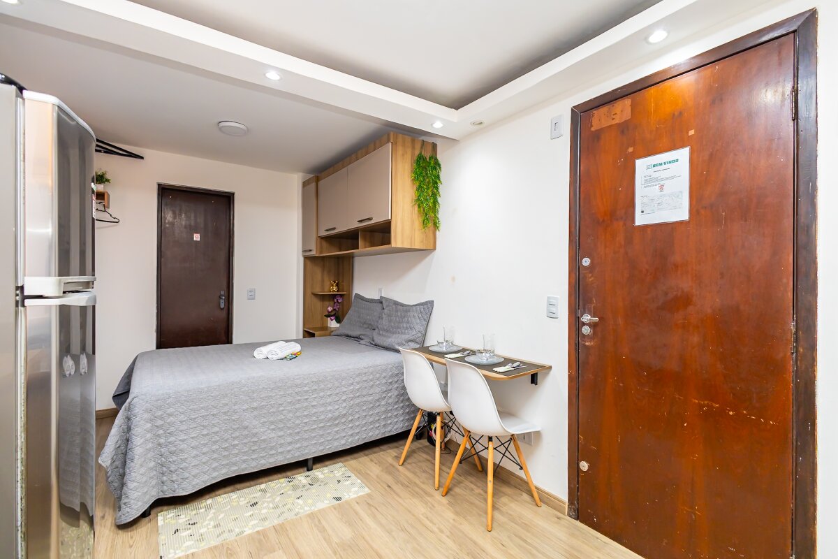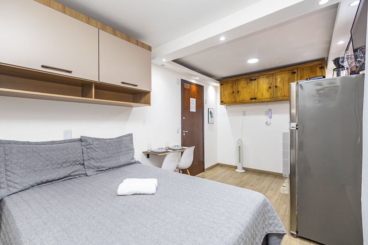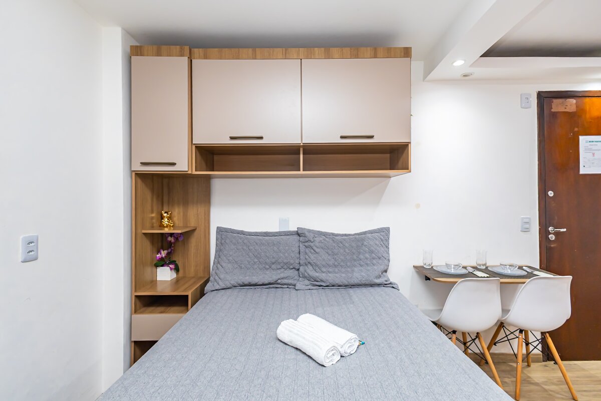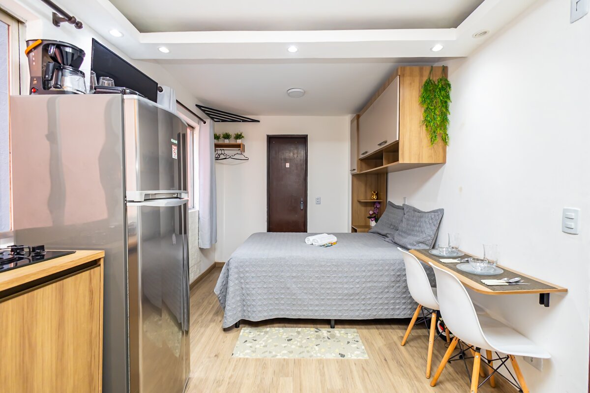 Com uma área privativa de 17,11m² e área total de 29,13m², o estúdio é compacto e funcional, ideal para solteiros ou casais que buscam um espaço aconchegante para morar. Além disso, o imóvel já vem mobiliado